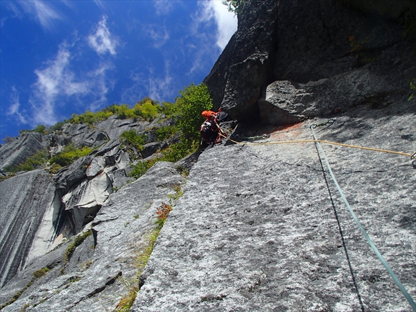 4P目(IV級、A1)、中嶋さんリード。正面のハングを左から越え、草付きの段々を登りテラスへ。
